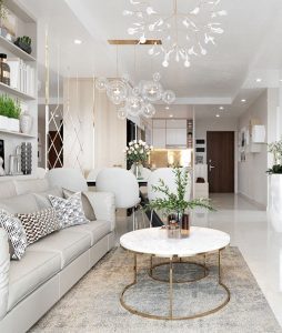 Đầu tiên, trái tim của căn nhà chính là phòng khách với nội thất lâu đài sang trọng. Chúng ta có thể thấy thiết kế nội thất Pháp tinh tế trong mỗi chi tiết trang trí, vẻ đẹp toát ra từ chính những đường cong tuyệt mỹ trong mỗi chi tiết nội thất. Đó là những đường nét hoa văn cầu kì, mỗi một chi tiết đều toát lên sự tinh xảo và nét lượn đầy gợi cảm trên bộ bàn ghế, đèn chùm … Khi được đặt cạnh nhau mới thực sự tỏa sáng, đồng điệu và hài hòa đến mê hoặc. Hơn nữa, với một màu chủ đạo trắng đến từ các nước Châu Âu, chúng ta càng thấy được sự tinh tế của nội thất biệt thự lâu đài. Cùng với hệ thống ánh đèn vàng nền nã như làm tôn thêm nét cổ kính, bề thế của gian nhà. Các chi tiết nội thất được cách điệu với mức độ hoàn thiện rất cao và vô cùng chi tiết.